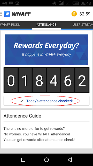 kita bisa dapat uang dari WHAFF, WHAFF adalah Aplikasi yang memberikan reward berupa uang dalam bentuk dollar, reward ini diberikan bila kita aktif download aplikasi yang dipromosikan di WHAFF, bisa di Premium Picks atau Whaff Picks, bisa berkisar $0.02 sampai $1, ditambah lagi kamu akan mendapatkan dollar jika cek kehadiran setiap hari, senilai $0.01.